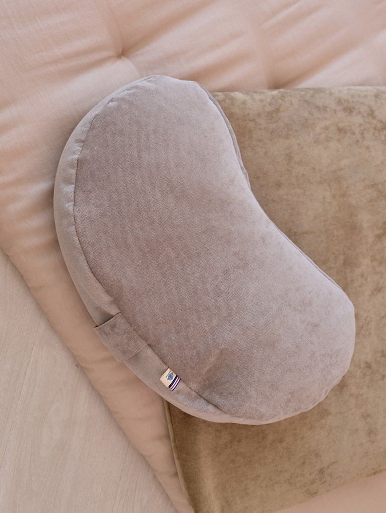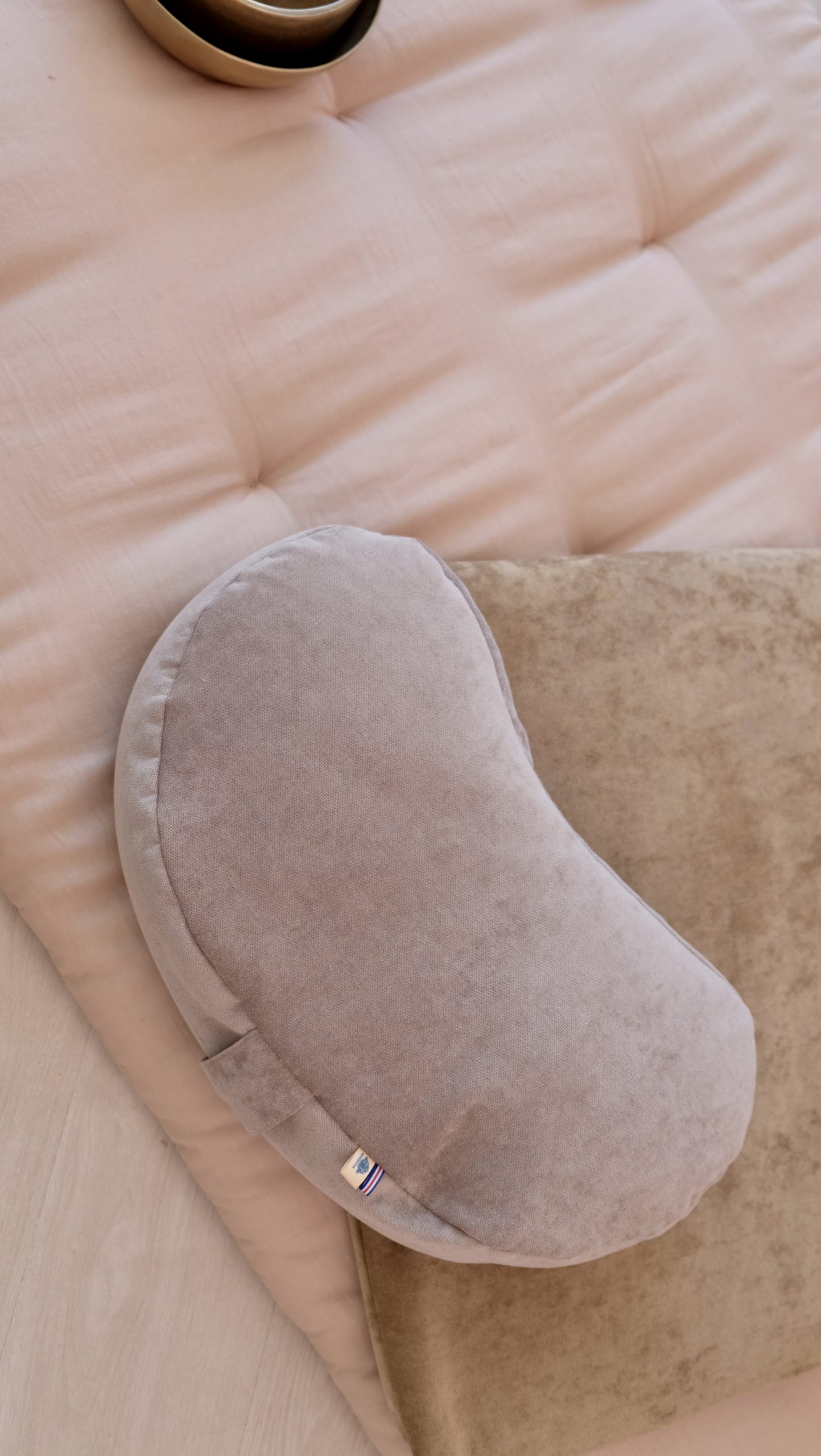 Coj铆n media luna para meditaci贸n. Tela loneta, poli茅ster o lino. Con relleno de granza. Dimensiones: 56 cm x 30 cm 9 cm de alto Lavable