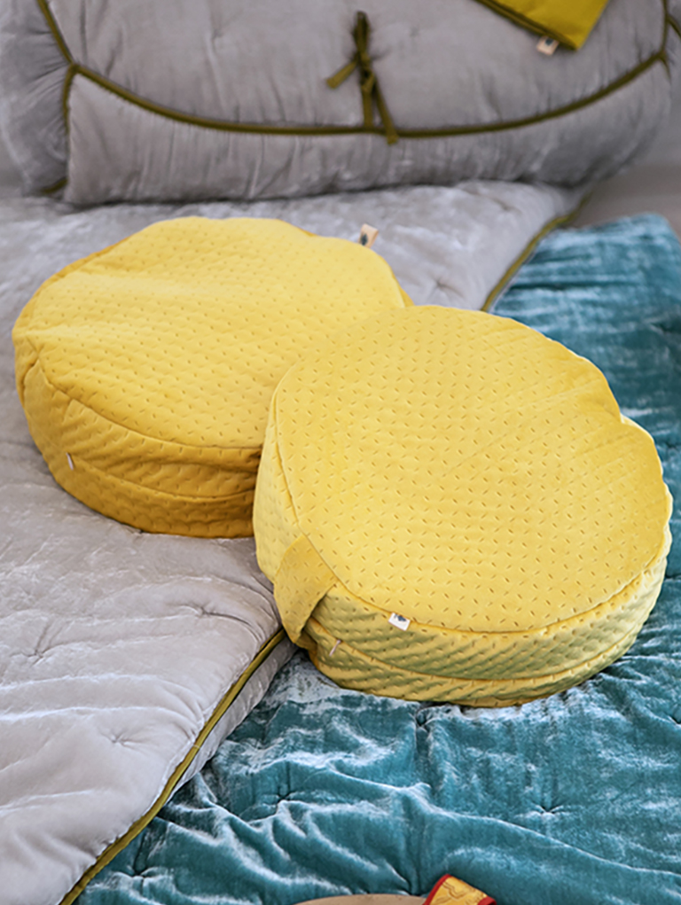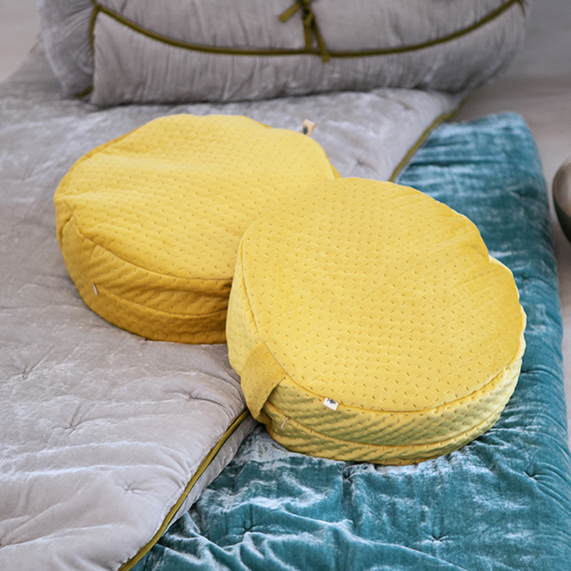 Coj铆n redondo para meditar sentado. Tela velvet, poli茅ster o lino. Dimensiones: 33 cm di谩metro x 12 cm de alto Lavable
